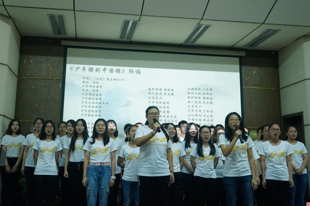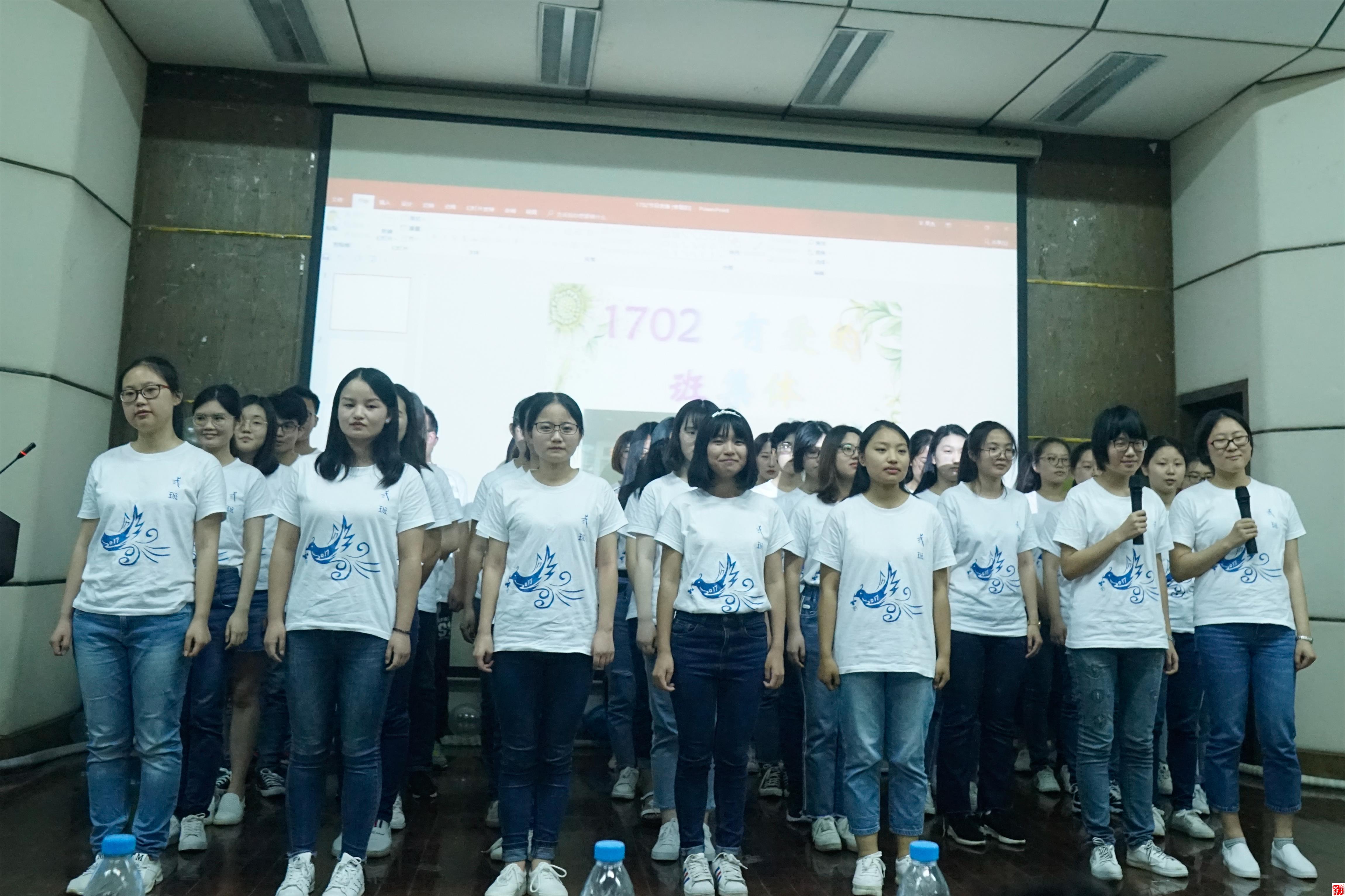 如果用婉约来形容1702班的展示,那么同为师范班的1701班的展示则应用大气一词形容。他们也同样采取了班级共同演唱作为节目展示,但不同的是,他们选择的曲目是充满气势《少年中国说》。他们激情昂扬的班级表演与其以祥云为主要设计元素的班服设计理念形成了互补,让我们看到了一个多面而多彩的1701班。
