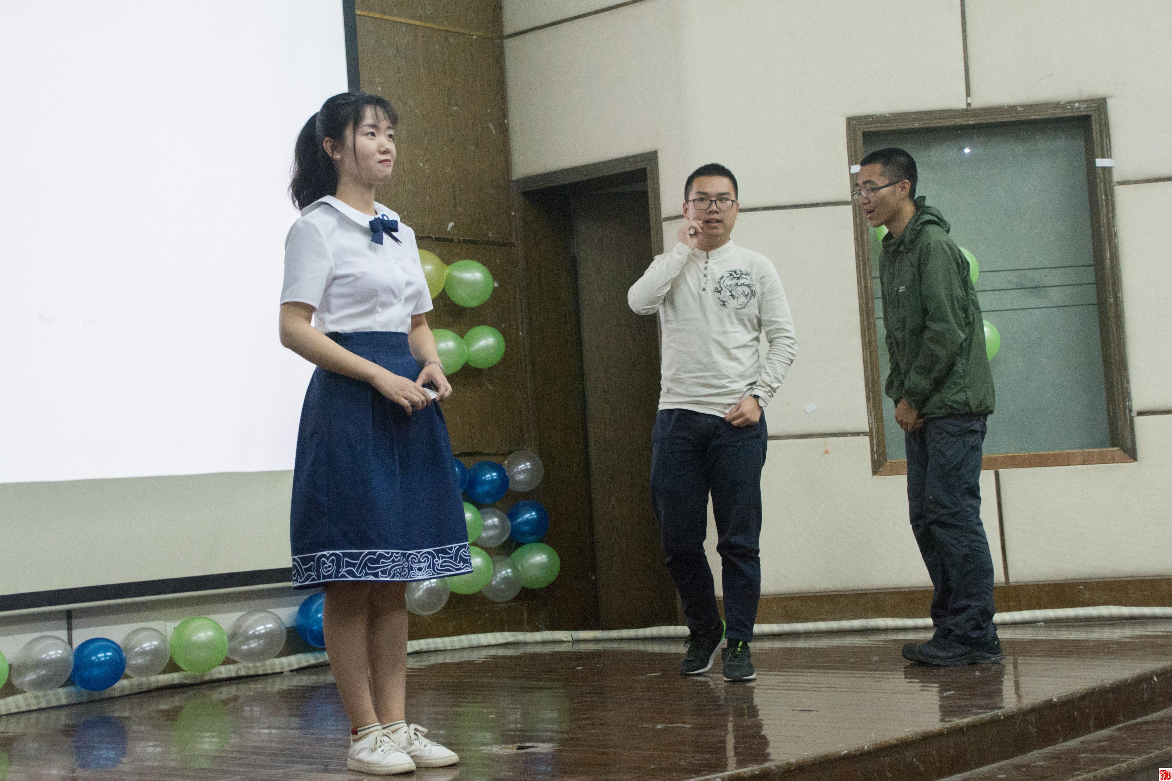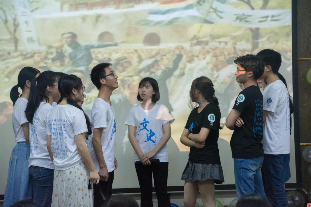 1705班的表演仿佛把在场人员带入了恬静的田园,而1704班的班服展示则以其活力又使现场躁动起。1704班正面以“文定乾坤,史同宇宙”八个艺术字构成环形图案,背面则印上中外文史名家所说名言。文史直播班的班服设计彰显着其文学与历史双专业这一最大特点,而随后其班级节目情景剧表演也始终贯彻着这一特点。1704班的情景剧以其幽默风趣的台词,紧张而紧凑的情节不仅将现场气氛推向了高潮,更深刻展示了文史直博班“文学”与“历史”一个都能少的这一专业特色。