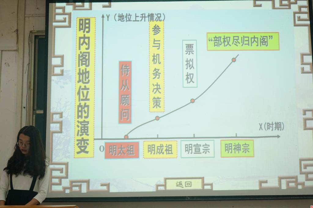 首先上台展示的是第四小组,展示者陈碧英,课件主题是古代手工业的进步。第四小组在课件中设计了小组讨论的形式,引导学生参与讨论,加深对教学内容的理解;在课后也准备了一些课后习题。而第七小组展示的是明清皇权和中央集权制度的强化。展示者王帆先将课件大致放映了一遍,接着阐释了自己小组课件的特色:课件内容和排版上具有层次性;通过重点标注加深学生的印象,追求主题表达清晰简单。